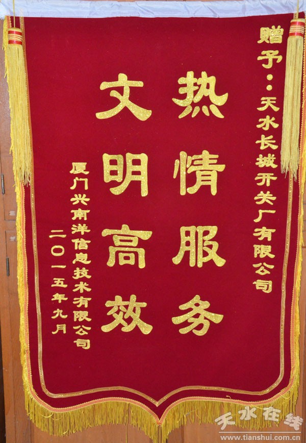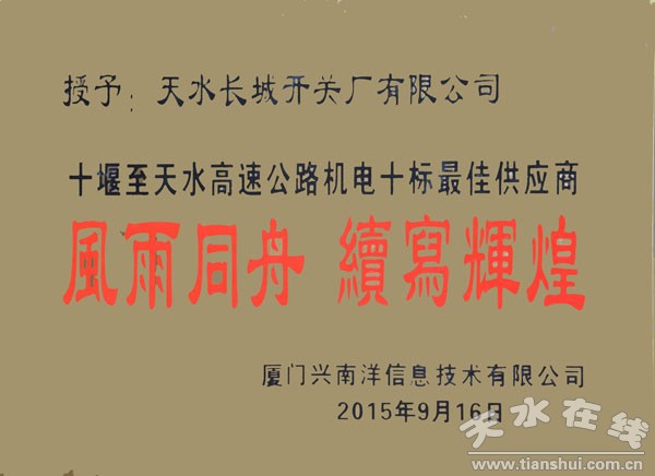 9月20日上午,廈門(mén)興南洋信息技術(shù)有限公司十堰至天水高速公路甘肅段STJD10標(biāo)項(xiàng)目經(jīng)理部負(fù)責(zé)人專(zhuān)程來(lái)到長(zhǎng)城電工天水長(zhǎng)城開(kāi)關(guān)廠有限公司,給長(zhǎng)開(kāi)廠公司送來(lái)“風(fēng)雨同舟、續(xù)寫(xiě)輝煌——十堰至天水高速公路機(jī)電十標(biāo)最佳供應(yīng)商”牌匾和“熱情服務(wù)、文明高效”的錦旗,對(duì)長(zhǎng)開(kāi)廠公司在該項(xiàng)目中的出色表現(xiàn)給予了高度贊揚(yáng)和肯定。
