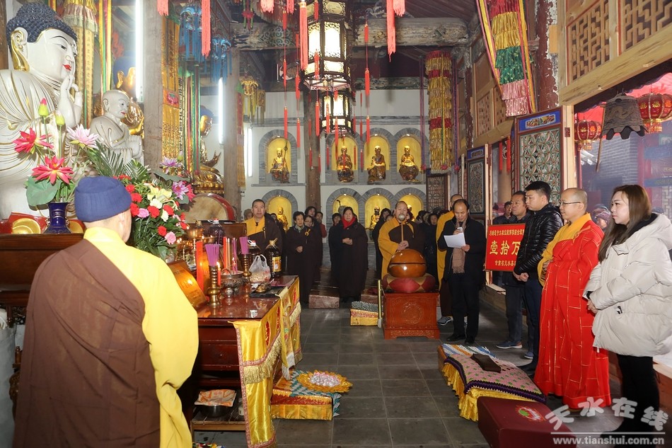 1月24日 ,臘八節(jié),天水市秦州區(qū)瑞蓮寺大雪紛飛,福瑞盈門。天水嘉通建設集團公司向瑞蓮寺捐款儀式在這里隆重舉行。同時,瑞蓮寺還為嘉通建設集團公司舉行了祈福法會。