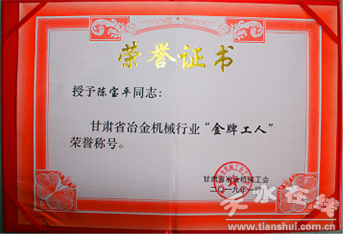 (授予陳寶平同志甘肅省冶金機(jī)械行業(yè)“金牌工人”榮譽(yù)稱(chēng)號(hào))
