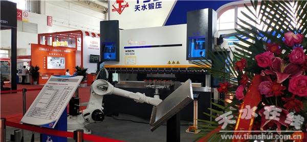天水鍛壓機(jī)床(集團(tuán))有限公司已參加北京機(jī)床展三十多年,今年展出的是一套機(jī)器人折彎單元。主機(jī)WS67K-100/3200 DA66T伺服泵控折彎機(jī),該機(jī)器節(jié)能環(huán)保減排,高速度,高效率,高精度。采用進(jìn)口數(shù)控系統(tǒng),觸摸式操作界面。液壓伺服控制。四軸鋁合金后擋料,工藝性好。集成化機(jī)械牢度補(bǔ)償機(jī)構(gòu)精度高?焖俚膿Q模機(jī)構(gòu)加工效率好,定制化服務(wù)。配備全自動(dòng)機(jī)器人,可實(shí)現(xiàn)柔性加工。