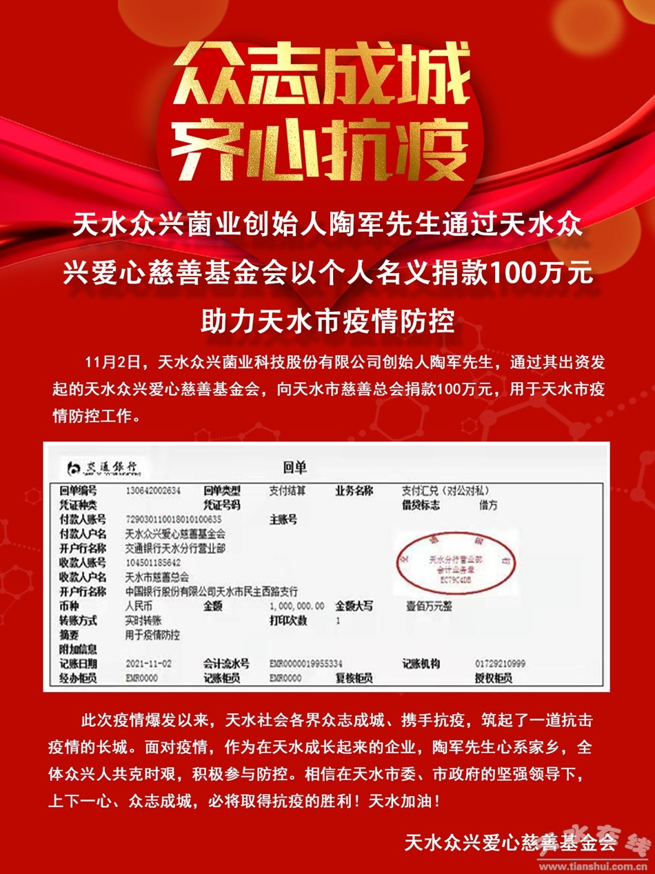 天水眾興菌業(yè)創(chuàng)始人陶軍以個人名義捐款100萬元助力天水疫情防控(圖)