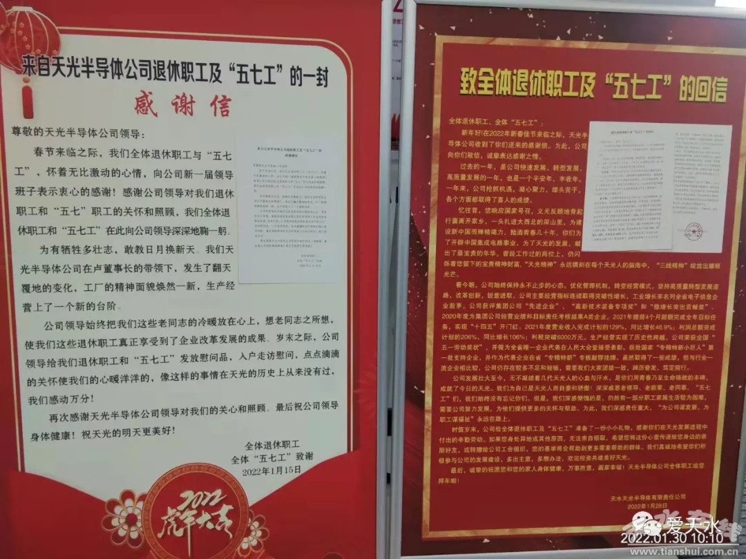 天水天光半導(dǎo)體有限責(zé)任公司遵循為企業(yè)謀發(fā)展,為員工謀福利的遵旨,2021年生產(chǎn)經(jīng)營(yíng)實(shí)現(xiàn)逆勢(shì)上揚(yáng),企業(yè)通過(guò)“揭榜掛帥”制度營(yíng)造全員創(chuàng)新氛圍,實(shí)現(xiàn)新品開(kāi)發(fā)和工藝公關(guān)新突破,同時(shí)企業(yè)積極做好員工關(guān)懷,尤其通過(guò)對(duì)退休員工開(kāi)展慰問(wèn),彰顯責(zé)任擔(dān)當(dāng),為企業(yè)文化建設(shè)凝聚發(fā)展力量。