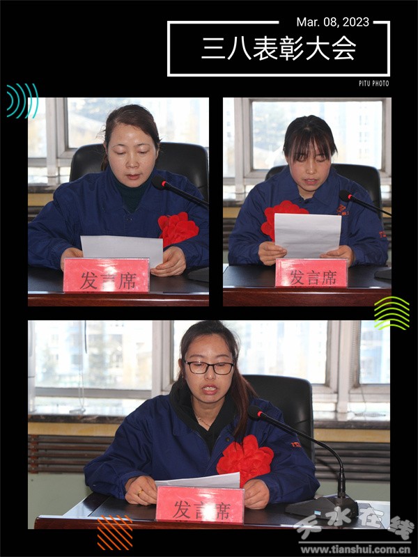 大會(huì)表彰了8名天水鍛壓三八紅旗手、6個(gè)天水鍛壓三八紅旗集體、14名天水鍛壓優(yōu)秀女職工。受表彰的先進(jìn)典型代表強(qiáng)瑋、高海燕、楊舉峰作了發(fā)言。