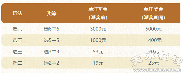 本次派獎(jiǎng)活動(dòng)由“選十中十”特別獎(jiǎng)、“選九中九”特別獎(jiǎng)和特定玩法獎(jiǎng)上獎(jiǎng)三部分組成。