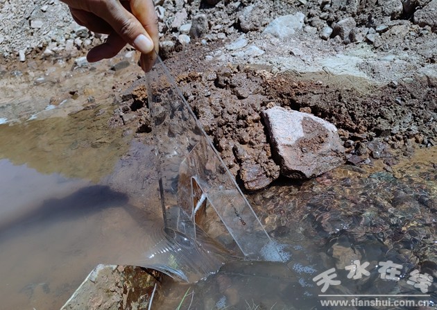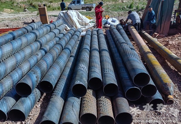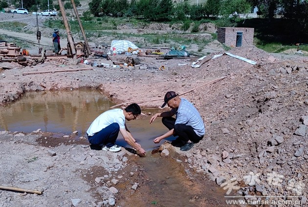 根據(jù)前期兩種物探方法的開展和含水性研究,普查隊專業(yè)技術(shù)人員在本勘查區(qū)內(nèi)圈定了兩處地下水資源開采的最佳靶區(qū),最終選擇了1處最佳靶區(qū)施工1眼水井鉆探孔。在保障安全的前提下,嚴(yán)格執(zhí)行綠色勘查相關(guān)要求,安排鉆機(jī)進(jìn)場進(jìn)行鉆探施工,最終于7月8日,該鉆孔成功出水,鉆孔深度220米,出水量約300.00立方米/天,本次項目取得了良好的成效。