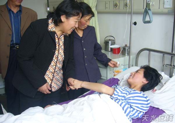 在建二小學(xué)和二十鋪小學(xué),市政府副市長蕭菡非常關(guān)切地詢問了學(xué)校的受災(zāi)情況及學(xué)生的上學(xué)情況,在教室和臨時搭建的帳篷里,教學(xué)秩序井然,她首先向在座的小朋友表示了節(jié)日的祝賀!并親切地對大家說:在這特殊的節(jié)日,老師一如既往地在堅守在工作崗位,孩子仍然勤奮學(xué)習(xí),不受地震的影響,這是一種最大的愛心和奉獻,希望大家同心協(xié)力度過這個艱難的時期。隨后,又赴天水市第一人民醫(yī)院看望慰問了平南中學(xué)的住院學(xué)生,黃郁、蕭菡、何道華等領(lǐng)導(dǎo)親切地拉著學(xué)生的手,詳細詢問了他們傷情的恢復(fù)情況,并鼓勵他們安心養(yǎng)傷,早日重返校園,同時還送去了節(jié)日的祝福和禮物。
