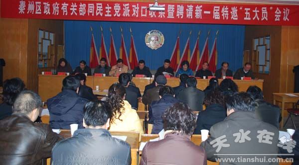 (秦州區(qū)委宣傳部 裴振剛)12月22日下午,秦州區(qū)召開區(qū)政府有關部門同民主黨派對口聯(lián)系暨聘請新一屆特邀“五大員”會議。會議總結回顧了近幾年來該區(qū)開展對口聯(lián)系和特邀“五大員”工作,聘請了新一屆特邀“五大員”,并就如何做好新世紀新階段政府有關部門同民主黨派對口聯(lián)系和特邀“五大員”工作進行了安排部署。