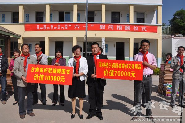 在慰問捐贈儀式上,省婦聯(lián)向關子鎮(zhèn)菲林格爾春蕾小學捐贈了價值10000元的圖書,上海菲林格爾甘肅總代理向關子鎮(zhèn)菲林格爾春蕾小學捐贈了價值70000元的桌凳和文體用品。