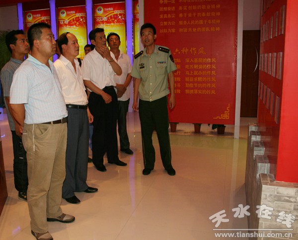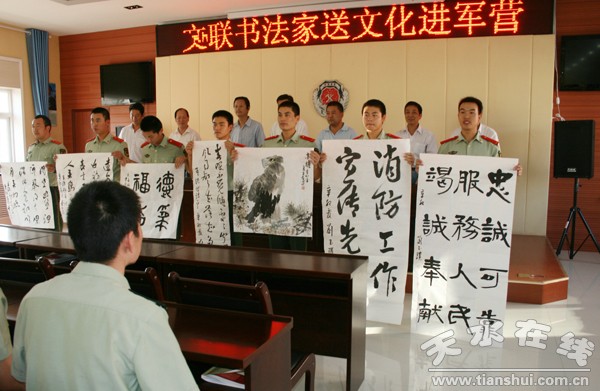 懷著對綠色軍營鐵血軍魂的崇高敬意,秦州區(qū)文聯(lián)在八一建軍節(jié)前夕舉辦這次書畫進軍營活動,旨在以中國傳統(tǒng)的藝術(shù)形式表達大家對子弟兵的熱愛,以飽含深情的作品詮釋軍民魚水一家人的深刻內(nèi)涵。消防官兵從藝術(shù)家們一絲不茍的創(chuàng)作中體會到了中國傳統(tǒng)文化的博大精深,升華了自己的藝術(shù)品位,豐富了軍營的文化生活。而他們訓(xùn)練有素、昂揚向上的精神風(fēng)貌也給藝術(shù)家們留下了深刻的印象,這次活動的成功舉辦,將為我區(qū)文學(xué)藝術(shù)事業(yè)的建設(shè)開辟一塊新的陣地。