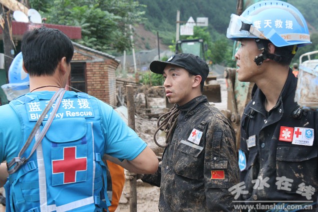 。ㄇ刂輩^(qū)外宣辦 劉可)在娘娘壩特大暴洪泥石流災(zāi)害搶險救災(zāi)一線,奮戰(zhàn)著一支由民間公益人士組成的專業(yè)緊急救援隊(duì)伍,他們的名字叫“藍(lán)天”。7月28日,在接到搶險救災(zāi)指揮部“進(jìn)入李子園向長河一線深入探查情況”的任務(wù)指令后,藍(lán)天救援隊(duì)派出5名先遣隊(duì)員挺近李子園。