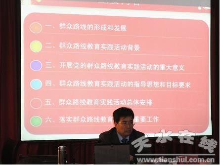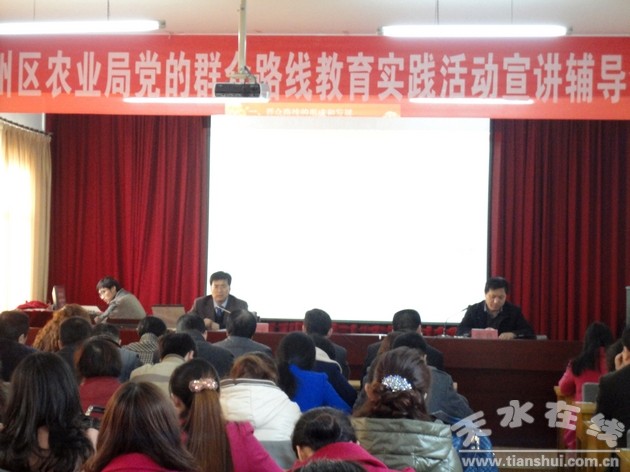 3月12日上午,秦州區(qū)農(nóng)業(yè)局舉行黨的群眾路線教育實踐活動專題輔導(dǎo)會,邀請秦州區(qū)委黨校常務(wù)副校長安公平作“堅持黨的群眾路線在全面深化改革中凝聚力量推動發(fā)展”專題講座并觀看《周恩來的四個晝夜》教育片。區(qū)農(nóng)業(yè)局領(lǐng)導(dǎo)班子在家成員及全體干部180多人參加了會議。