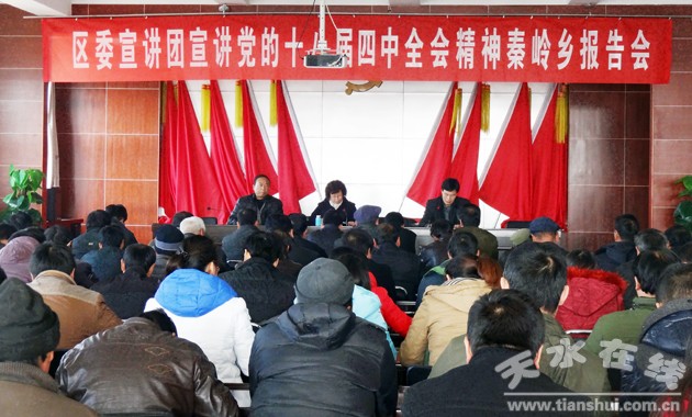 (秦州區(qū)外宣辦)為更好地深刻領(lǐng)會(huì)十八屆四中全會(huì)的精神實(shí)質(zhì)和豐富內(nèi)涵,推動(dòng)全區(qū)學(xué)習(xí)活動(dòng)深入扎實(shí)開展。12月5日,秦州區(qū)宣講團(tuán)赴秦嶺鄉(xiāng)就十八屆四中全會(huì)精神進(jìn)行了宣講。鄉(xiāng)村兩級(jí)干部、鄉(xiāng)屬單位主要負(fù)責(zé)人共100余人聆聽了報(bào)告。