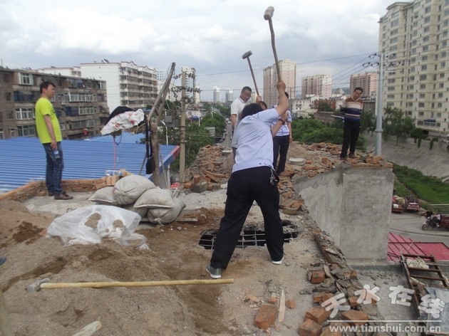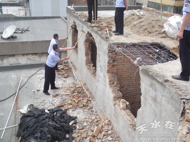 但當(dāng)事人抱有僥幸心理,不但未按要求拆除,還利用中午和晚上的空擋時(shí)間加緊施工,一夜之間對加蓋的第三層房屋完成了封頂。執(zhí)法人員發(fā)現(xiàn)后耐心地向當(dāng)事人做思想工作,講解相關(guān)法律法規(guī),動(dòng)員當(dāng)事人自行拆除消除影響。但是當(dāng)事人在規(guī)定的期限內(nèi)并未拆除。6月1日下午,中隊(duì)組織全隊(duì)執(zhí)法人員對姚某擅自建設(shè)的房屋依法進(jìn)行拆除,拆除面積共計(jì)50平方米。