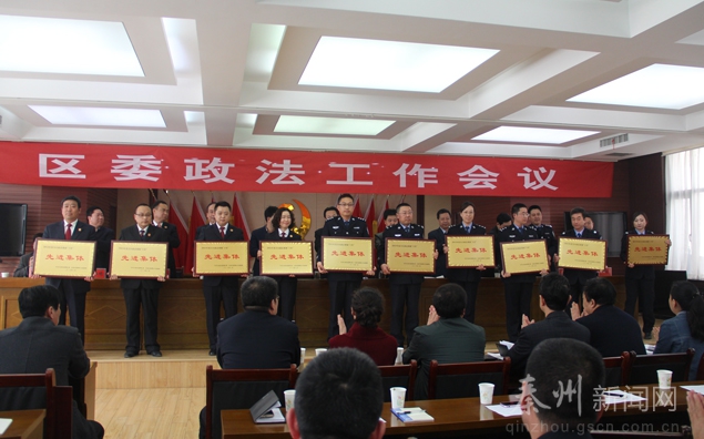 (秦州區(qū)外宣辦)3月18日下午,秦州區(qū)召開區(qū)委政法工作會(huì)議,傳達(dá)學(xué)習(xí)中央和省委、市委政法工作會(huì)議精神,秦州區(qū)委副書記、區(qū)長何東出席會(huì)議并作講話,區(qū)委常委、政法委書記趙虎生全面安排部署了2016年政法工作,區(qū)人大常委會(huì)副主任王貴友,區(qū)政協(xié)副主席安雖奮,政法委班子成員和法、檢、公、司“四長”出席會(huì)議。