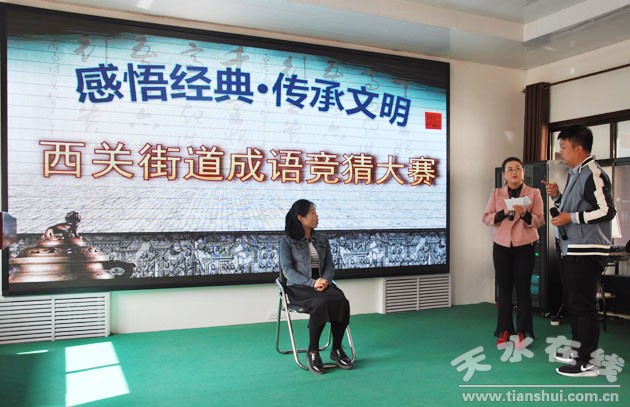 為營(yíng)造良好的文化氛圍,傳承中國(guó)文化經(jīng)典,4月21日下午,秦州區(qū)西關(guān)街道辦事處在市軍休所多功能室舉辦了“感悟經(jīng)典·傳承文明”成語(yǔ)競(jìng)猜大賽,街道社區(qū)干部及居民100余人參加了此次活動(dòng),為豐富基層干部群眾的文化生活起到了積極的推動(dòng)作用。
