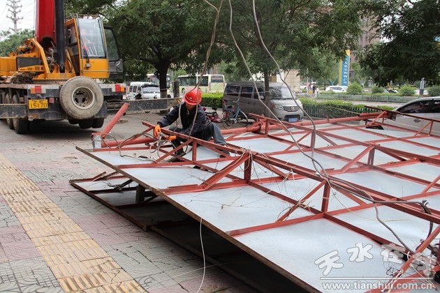 根據(jù)全市創(chuàng)建全國文明城市和國家園林城市工作的總體部署、全域無垃圾創(chuàng)建以及《天水市優(yōu)化城市環(huán)境提升城市形象工程實施方案》的具體要求,秦州區(qū)戶外廣告整治再發(fā)力,重點為城區(qū)內(nèi)建筑物頂部的各類廣告牌、標(biāo)識牌、單體字等。近日,秦州區(qū)七里墩建材市場戶外廣告專項整治率先啟動。執(zhí)法局組織執(zhí)法人員,七里墩建材市場積極配合,雇用專業(yè)拆除人員10名、大型吊車1臺,人工作業(yè)和機械拆除的辦法,截至9月19日,已完成樓頂37塊戶外廣告的拆除工作,面積2700平方米,目前正在對樓體側(cè)立面的15塊戶外廣告實施拆除。