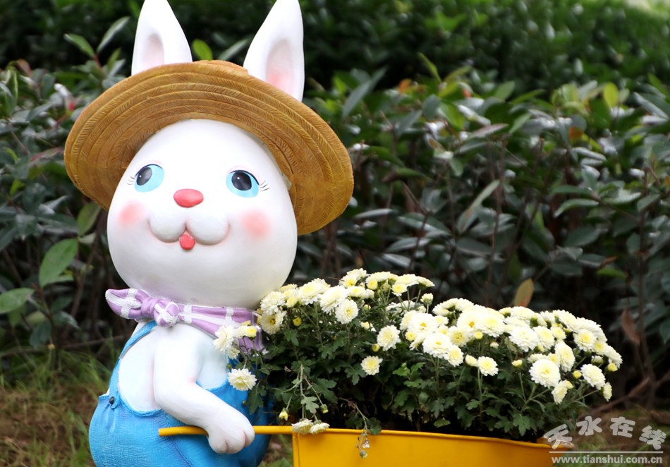 園路兩旁設(shè)置了栩栩如生的兔子雕塑、卡通造型、懸吊花籃等,增加公園趣味的同時,也能銜接起下一個展區(qū)。
