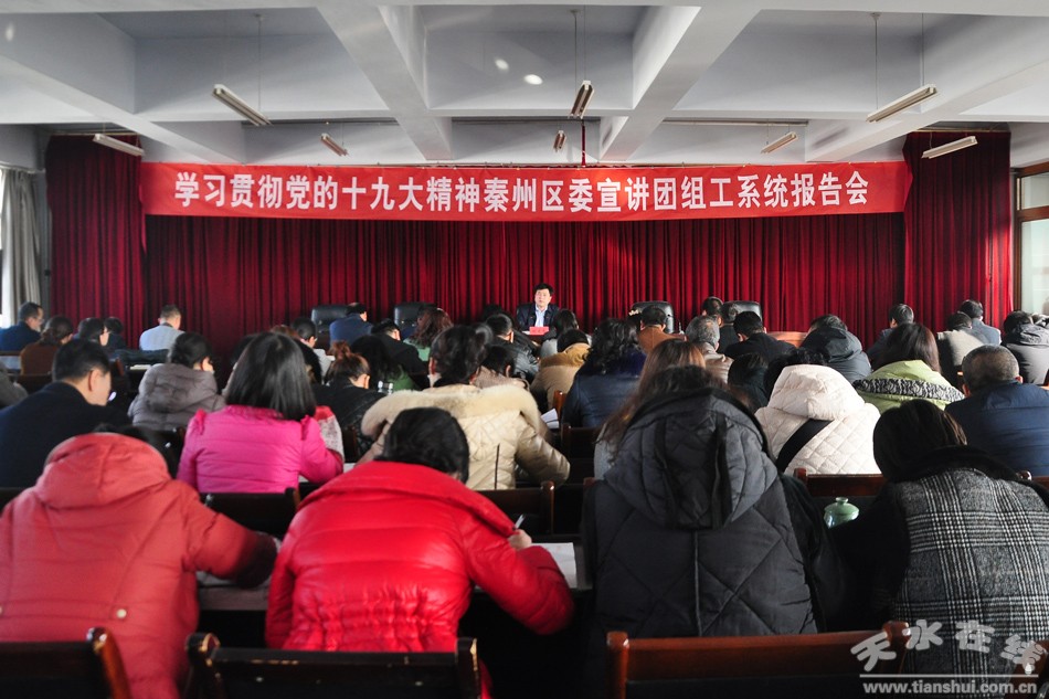 。ㄇ刂輩^(qū)外宣辦 王利花)近日,學(xué)習(xí)貫徹黨的十九大精神秦州區(qū)委宣講團組工系統(tǒng)報告會在區(qū)人社局開講。區(qū)委常委、組織部長、學(xué)習(xí)貫徹黨的十九大精神區(qū)委宣講團成員趙虎生為組工系統(tǒng)黨員干部宣講了黨的十九大精神。
