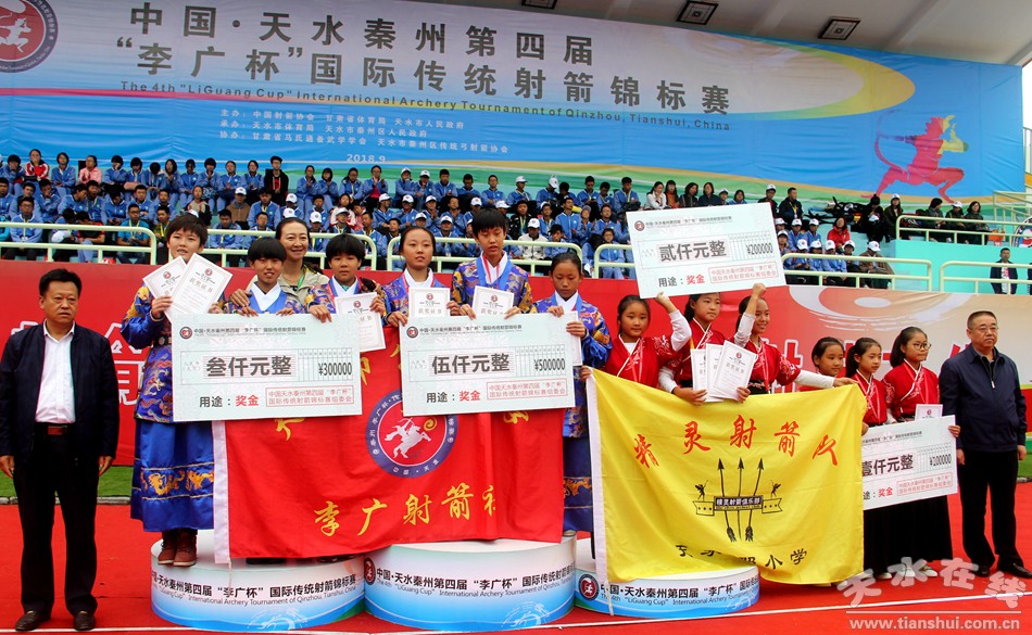 西北名族大學(xué)體育學(xué)院院長劉可,秦州區(qū)人大常委會(huì)主任文月平為秦州區(qū)天水郡小學(xué)代表隊(duì)等獲得現(xiàn)代傳統(tǒng)弓少年組男子團(tuán)體前四名的代表隊(duì)頒發(fā)了獲獎(jiǎng)證書和獎(jiǎng)金。