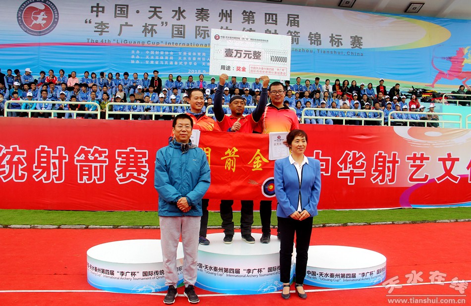 國家體育總局射擊射箭運(yùn)動(dòng)管理中心社會(huì)發(fā)展部副部長盧瑞強(qiáng),秦州區(qū)政協(xié)副主席郭金霞為獲得傳統(tǒng)竹木弓團(tuán)體第一名的金箭門隊(duì)頒發(fā)了獲獎(jiǎng)證書和獎(jiǎng)金。