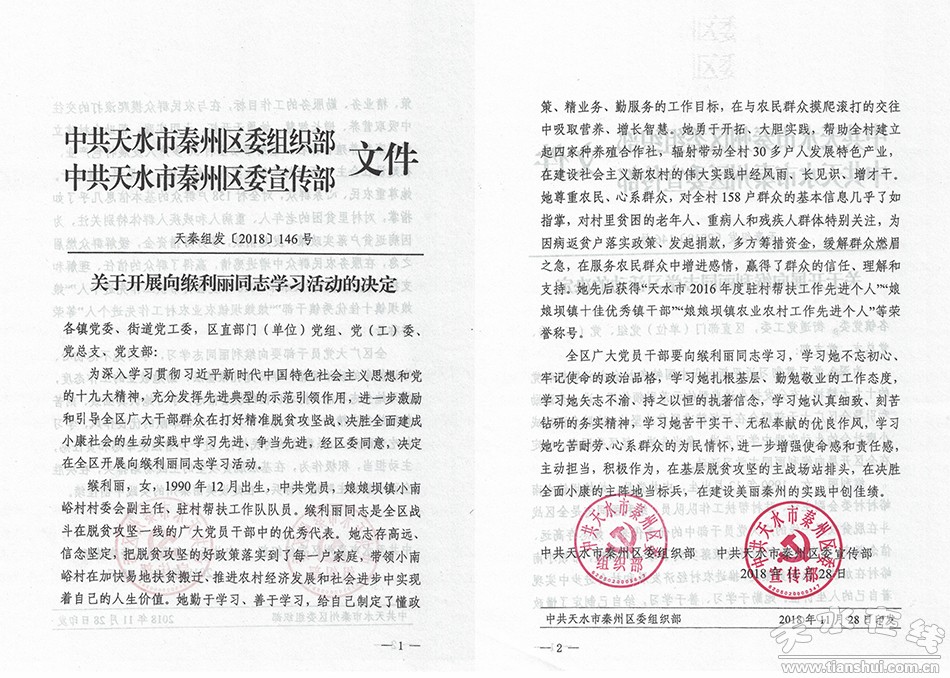 秦州區(qū)外宣辦11月28日訊(劉可)28日,中共天水市秦州區(qū)委組織部、區(qū)委宣傳部聯(lián)合印發(fā)《關于開展向緱利麗同志學習活動的決定》,號召全區(qū)廣大黨員干部向緱利麗同志學習。
