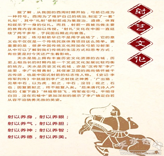 第五屆中國(guó)·天水秦州“李廣杯”國(guó)際傳統(tǒng)射箭錦標(biāo)賽將于2019年9月12日在秦州舉行!袄顝V杯”國(guó)際傳統(tǒng)射箭錦標(biāo)賽源于李廣射“虎”之典故。臨近賽事,讓我們一起先來了解一下射藝文化。