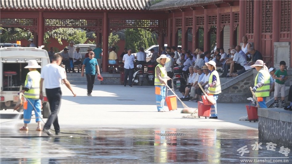 一大早,記者在伏羲廟看到,環(huán)衛(wèi)工人正在清掃垃圾,沖洗路面,他們不顧高溫,辛勤勞作。