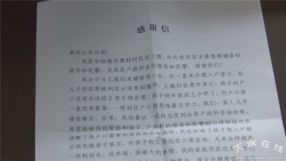 最后,安三楞抱著試一試的想法撥打了秦州公安分局戶政科的電話。沒想到,正是這個(gè)電話讓他一直犯愁的事情有了解決辦法。戶政科的民警耐心細(xì)致地向安三楞講解了報(bào)戶口所需要的相關(guān)資料和辦理流程。孩子要入戶就必須先做親子鑒定,但孩子的父親遠(yuǎn)在云南監(jiān)獄,光采血樣就是一件耗時(shí)長(zhǎng) 成本高、困難大的事情,安三楞自己實(shí)在沒有辦法解決,事情再度陷入僵局。