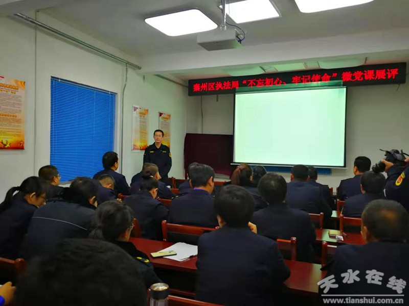 在推動(dòng)“不忘初心、牢記使命”主題教育不斷走深走實(shí)活動(dòng)中,11月16日上午,秦州區(qū)執(zhí)法局舉行“不忘初心、牢記使命”微黨課展評(píng)活動(dòng),各黨組織書(shū)記、黨務(wù)干部、普通黨員共計(jì)40余人參加。