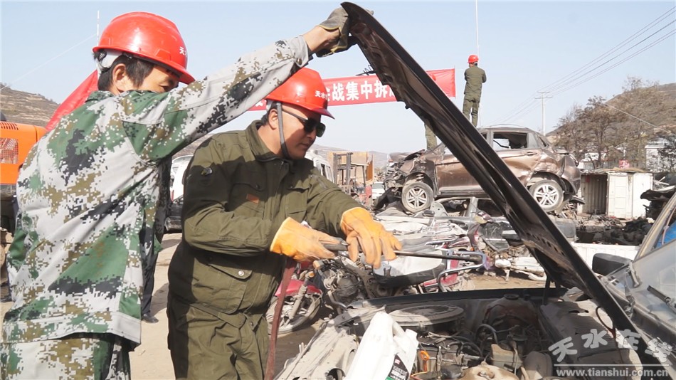 在現(xiàn)場,報廢公司用專業(yè)的工具對報廢的車牌進行剪切,對報廢車輛進行集中拆解。