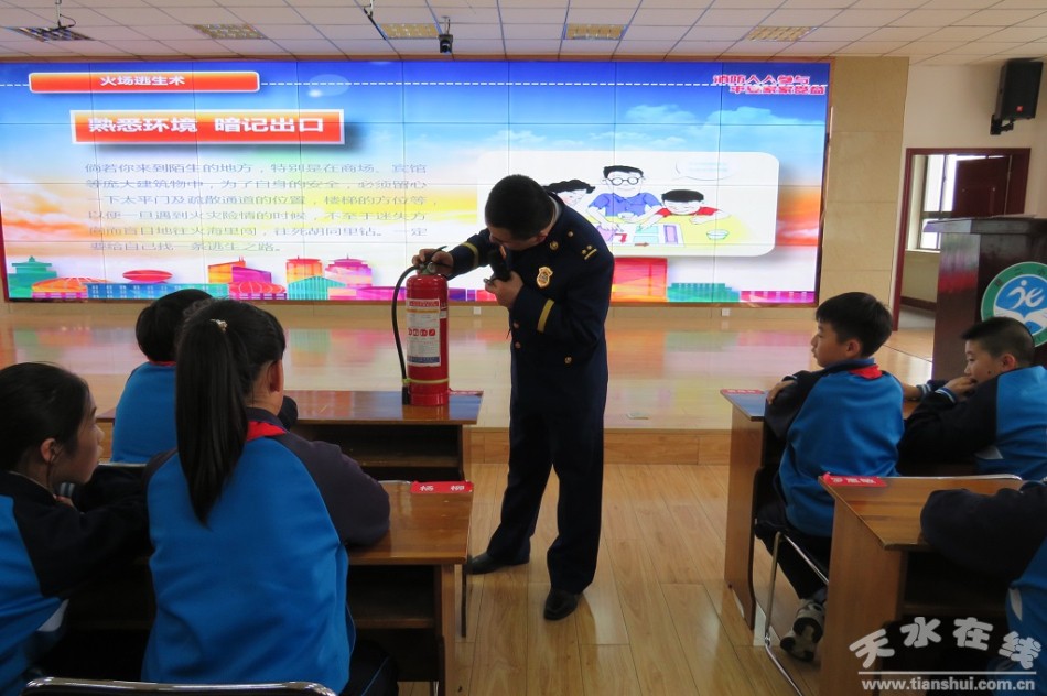 此次培訓(xùn),秦州大隊(duì)宣講員以PPT課件形式進(jìn)行展示,以現(xiàn)場教與學(xué)為主進(jìn)行培訓(xùn)。“同學(xué)們,電器起火我們應(yīng)該怎么辦?”“切斷電源,呼叫大人!闭n堂中,大隊(duì)宣講員對學(xué)生們采取提問、互動等形式,向?qū)W生詳細(xì)講解造成火災(zāi)的原因、預(yù)防火災(zāi)的方法、發(fā)生火災(zāi)時的應(yīng)對措施、滅火器的正確使用方法及注意事項(xiàng)等相關(guān)知識。并要求同學(xué)們不攜帶火種進(jìn)校園,不私自用火;要提醒父母正確使用燃?xì)庠、不隨意燃燒廢紙、紙錢,亂扔煙頭;發(fā)生火災(zāi)時,切記慌亂,要沉著冷靜,切勿使用電梯逃生,用袖口或濕毛巾捂住口鼻,低姿勢沿著應(yīng)急燈或指示標(biāo)識方向逃生。