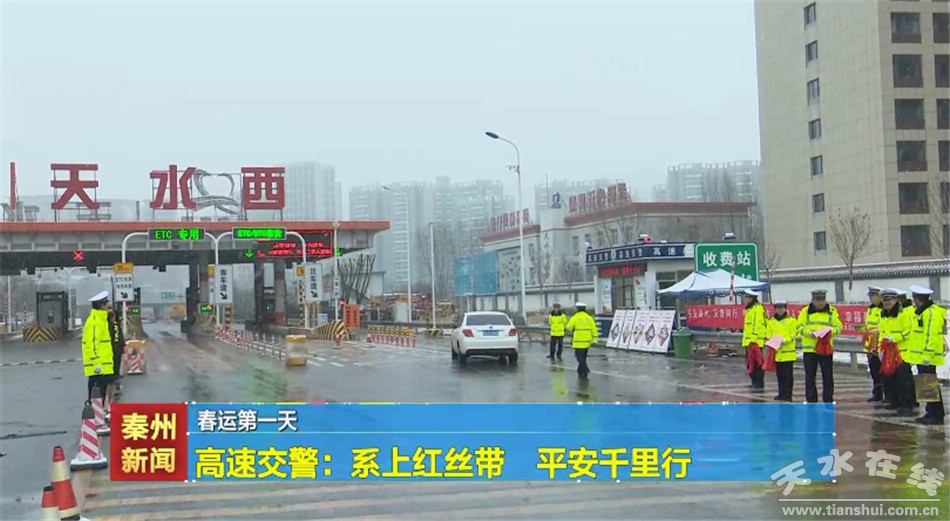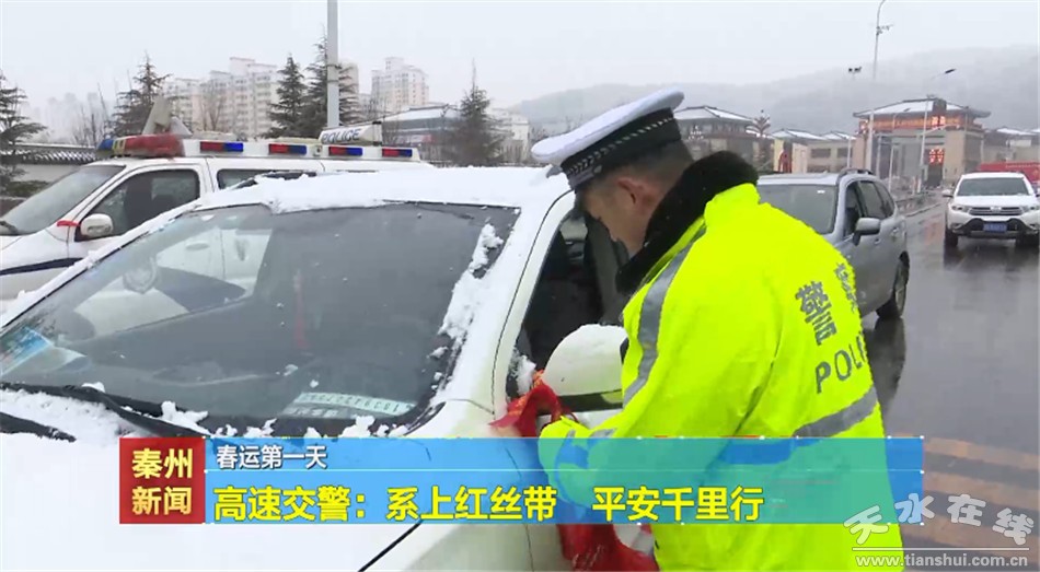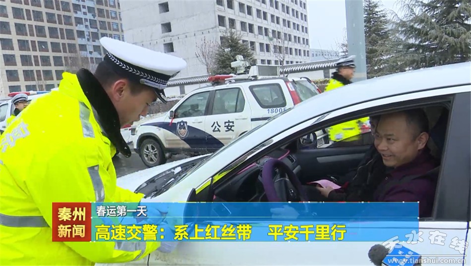 “今天是春運啟動儀式,天水公安祝您一路平安。謝謝。路上結(jié)冰了,注意安全。謝謝。一路平安......”上午八點,在天水西高速公路入口,玉泉高速交警舉行了春運啟動儀式,隨后民警們將一根根紅絲帶系到過往車輛后視鏡上,時刻提醒駕駛員安全出行,同時民警向過往司乘人員發(fā)放春運宣傳年畫和提示卡,講解出行安全注意事項,提醒大家自覺遵守道路交通安全法律法規(guī),自覺拒絕超速、超員、疲勞駕駛及酒駕醉駕行為,在回家路上莫忘安全,安全才是回家最近的路。同時對;嚰捌咦陨系目瓦\車輛逢車必查,逐車登記,嚴查嚴處各類交通違法行為,簽訂責任書,嚴把出入口第一道防線,確保群眾在春運期間的平安暢通。