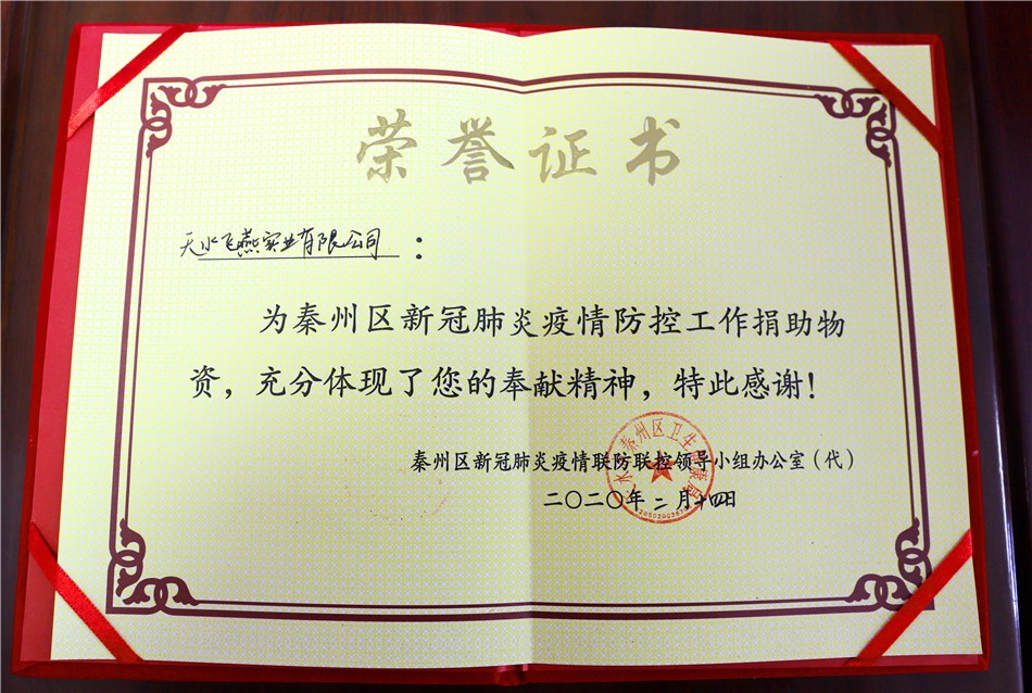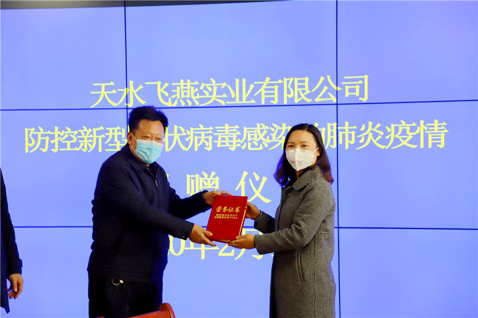 區(qū)人大常委會主任宋丕林參加捐贈儀式,并為天水飛燕實業(yè)有限公司頒發(fā)了榮譽證書,感謝他們?yōu)榍刂輩^(qū)疫情防控所做的貢獻(xiàn)和支持。(供稿 秦州區(qū)衛(wèi)生健康局孫濤/編輯張敏)