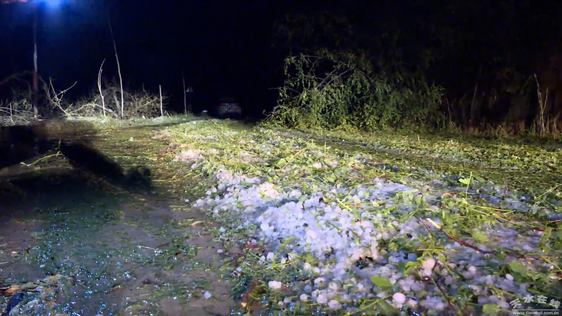 6月1日凌晨一點,記者在中梁鎮(zhèn)座崖村村民的蘋果園看到,盡管距離冰雹的結束已經(jīng)過去了五個小時,但整個果園內依然是白茫茫的一片。