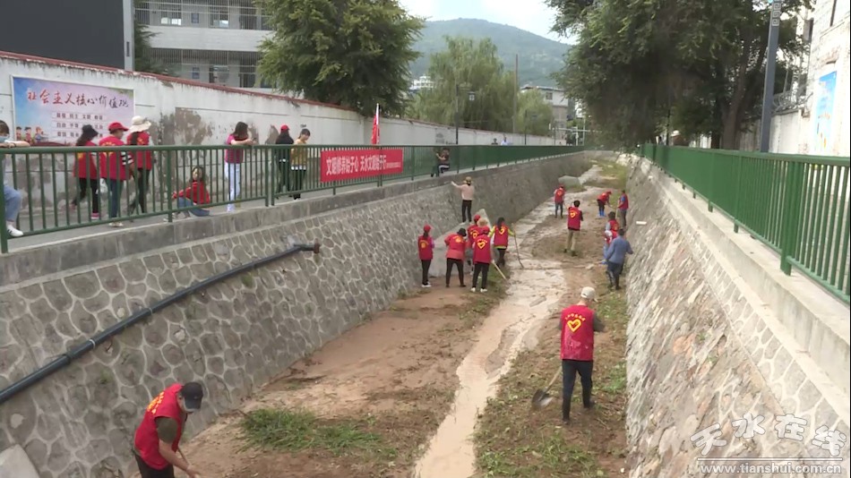 在豹子溝口,天水郡街道蓮?fù)ど鐓^(qū)組織志愿者對河道進(jìn)行清淤,積極消除汛期安全隱患。