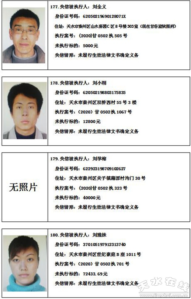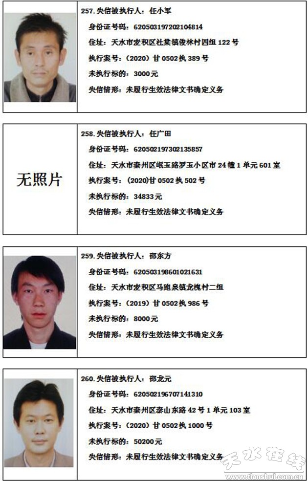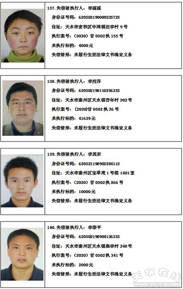 五、歡迎廣大人民群眾向天水市秦州區(qū)人民法院執(zhí)行指揮中心舉報(bào)被執(zhí)行人的財(cái)產(chǎn)線索和下落,監(jiān)督限制被執(zhí)行人的消費(fèi)和經(jīng)營行為。監(jiān)督舉報(bào)電話:0938-8214290。