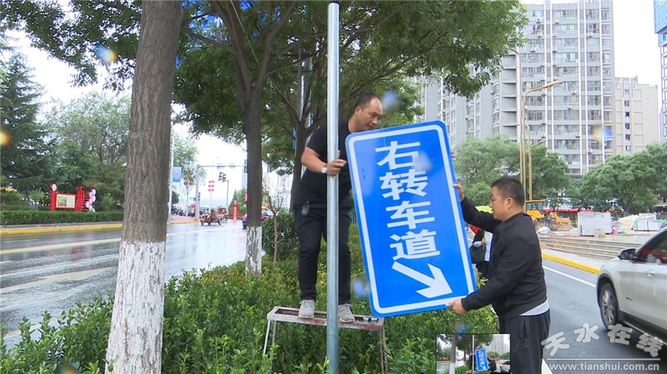 9月24日中午,記者在藉河北路看到,施工人員正在安裝右轉(zhuǎn)專用車道指示牌。右轉(zhuǎn)專用車道通車后,十字路口道路暢通,即使是下雨天也不再擁堵。