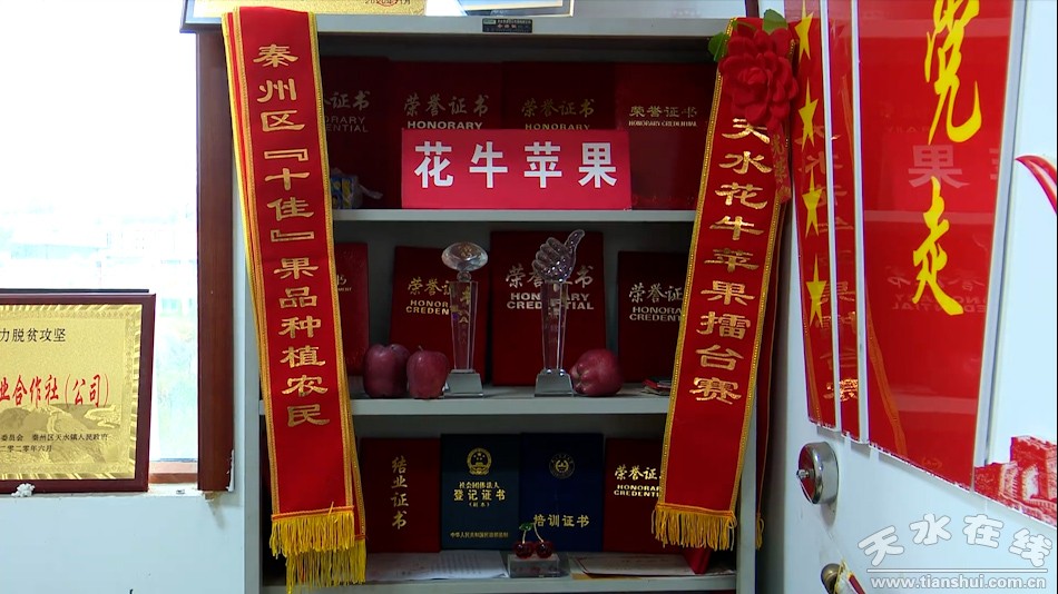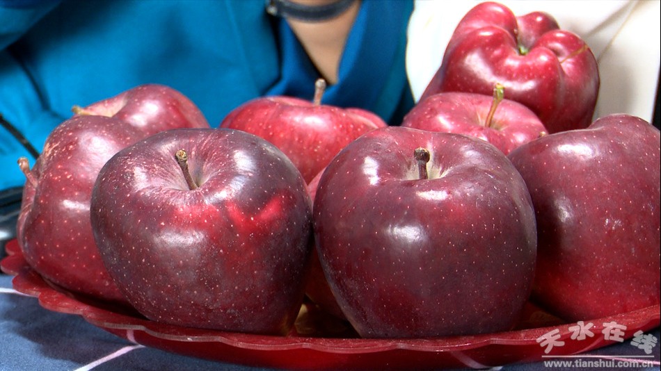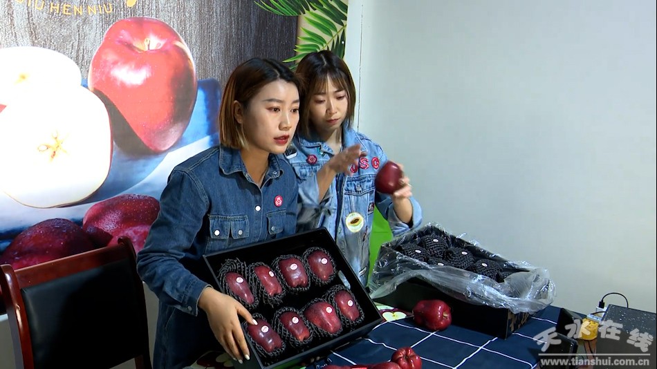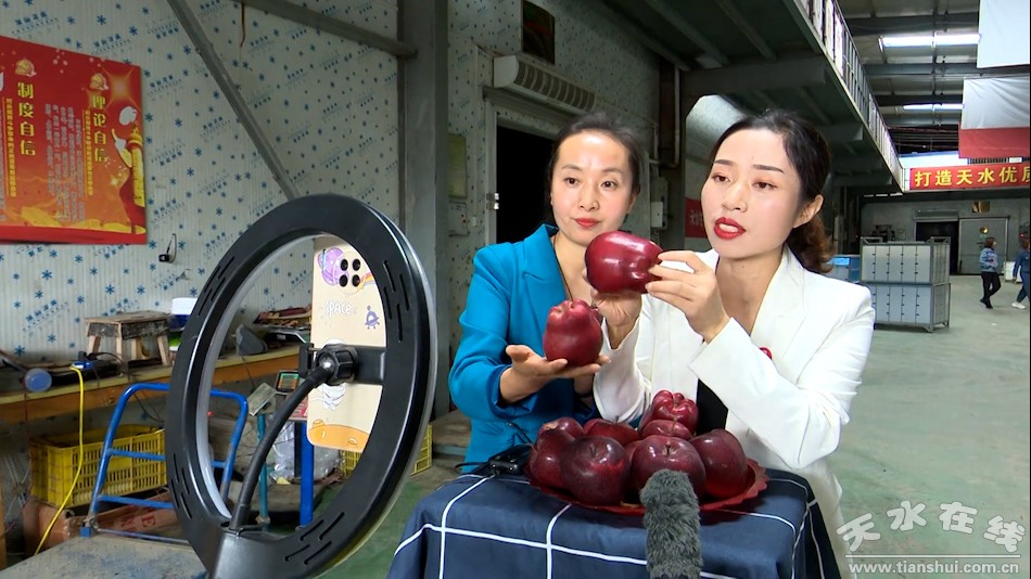 在天水鎮(zhèn)果品產(chǎn)業(yè)基地,機(jī)器正在運(yùn)送組裝果子,碩大鮮美的蘋果在擺盤里散發(fā)光澤,兩名“村花”直播團(tuán)的主播正在熱情飽滿地進(jìn)行線上直播,推銷天水花牛蘋果。