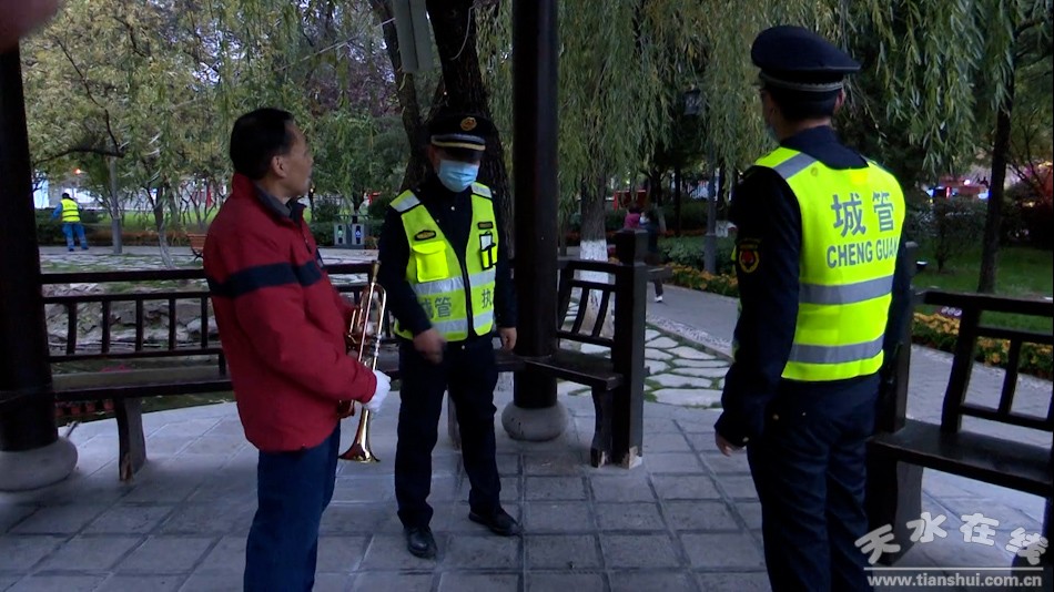 在人民公園,區(qū)城市管理綜合執(zhí)法局工作人員加大巡查力度,對公園內(nèi)晨練和跳廣場舞的群眾進行柔性勸導、勸離,同時提示市民要佩戴口罩,保持安全社交距離。