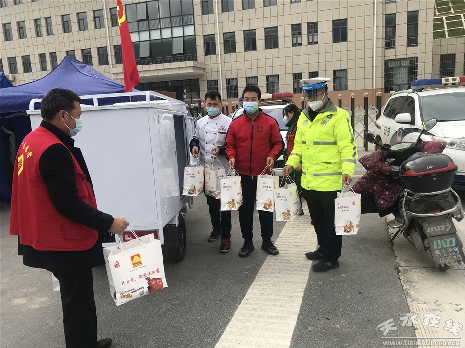 無私捐贈暖人心,齊心協(xié)力同抗疫。疫情當(dāng)前,以中鐵十一局、秦州區(qū)移動公司太京網(wǎng)格、中梁石場為代表的社會各界、轄區(qū)內(nèi)各企業(yè)紛紛履行社會責(zé)任,捐贈了方便面、礦泉水、口罩、84消毒液等物資,秦州區(qū)片片香肉夾饃店、老巷道餐館為天水北高速公路出口卡點(diǎn)值班值守的“先鋒隊”送上愛心餐飯,為共同抗疫增添了信心和動力。