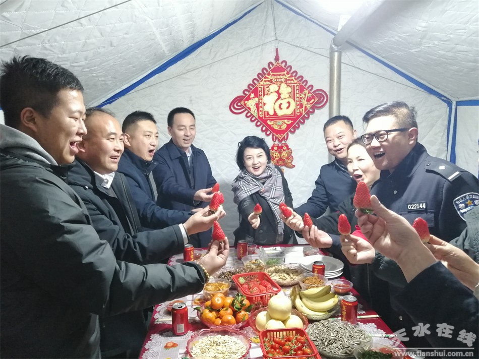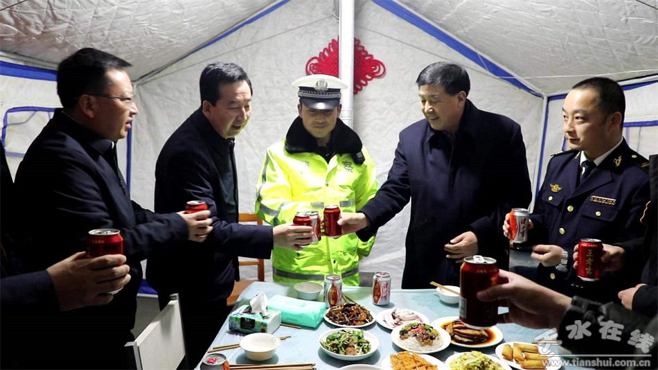 慰問組分別來到高速公路天水南、天水北、關(guān)子鎮(zhèn)、藉口鎮(zhèn)、天水鎮(zhèn)出口、天水智選假日酒店醫(yī)學(xué)觀察隔離點(diǎn)、區(qū)新冠肺炎疫情防控指揮部辦公室,帶著最誠摯的祝福與值班值守人員一一握手,詳細(xì)了解交通卡口疫情防控措施落實(shí)及一線工作人員工作生活保障情況,為他們送上了生活物資和可口的年夜飯,和交通卡點(diǎn)值守人員圍著火爐一起話家常、吃餃子、迎新春,讓疫情防控一線人員“在崗過年”更溫暖。