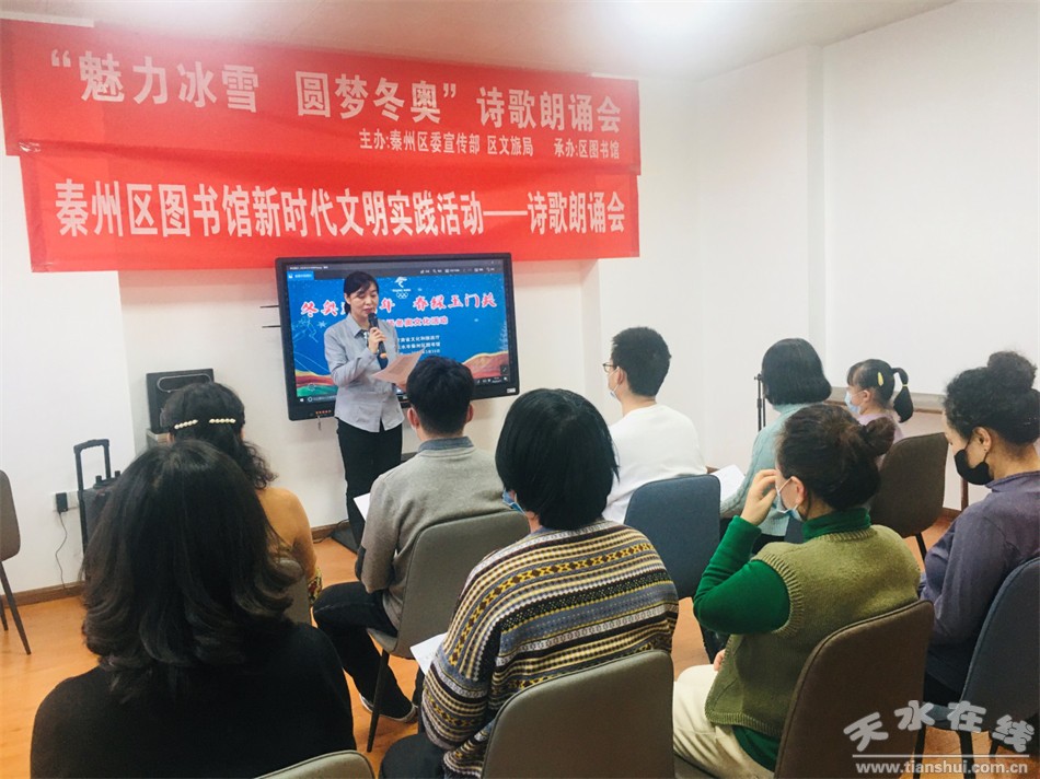 書香迎冬奧·詩意過大年。推動全民閱讀活動廣泛開展,秦州區(qū)圖書館舉辦“書香迎冬奧·喜慶過大年”——進(jìn)社區(qū)、進(jìn)鄉(xiāng)鎮(zhèn)送書籍、2022年迎新春文化惠民等活動,為社區(qū)贈送500余冊書籍,此次送去的圖書內(nèi)容豐富,有家庭教育、健康知識、新華文摘、少兒讀物及使用知識、文化娛樂等五大類,活動受到了廣大群眾的一致喜愛和好評。秦州區(qū)圖書館還舉辦了“魅力冰雪·圓夢冬奧”詩歌朗誦會,朗誦會既有弘揚(yáng)奧運(yùn)精神、謳歌新時代的作品,又有發(fā)揚(yáng)革命傳統(tǒng),表現(xiàn)家國情懷的紅色內(nèi)容,還有文藝類詩文及經(jīng)典古詩詞朗誦等。豐富多彩的內(nèi)容和朗誦者健康樂觀的精神風(fēng)貌交相輝映,為冬奧會加油鼓勁的同時,也為新春佳節(jié)送上了詩意濃濃的別樣祝福。