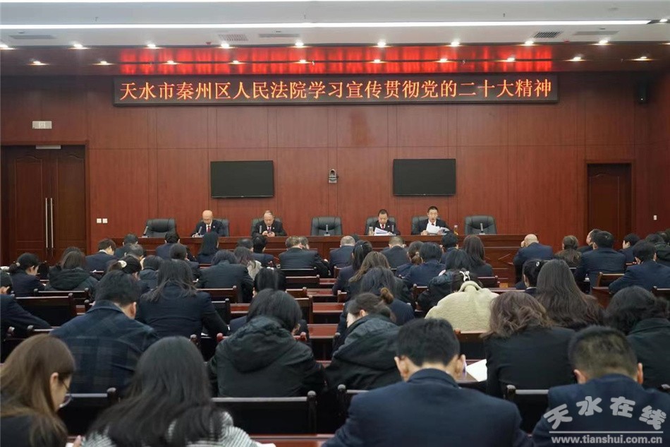 秦州區(qū)人民法院召開全院干警大會,專題學(xué)習(xí)黨的二十大精神。會議強(qiáng)調(diào),要把學(xué)習(xí)貫徹黨的二十大精神作為當(dāng)前和今后一段時期的主要政治任務(wù)抓緊抓實(shí),進(jìn)一步強(qiáng)化思想政治引領(lǐng),自覺把思想和行動統(tǒng)一到黨的二十大精神上來,堅(jiān)定不移地以習(xí)近平新時代中國特色社會主義思想為統(tǒng)領(lǐng),深入踐行習(xí)近平法治思想,教育引導(dǎo)全體干警堅(jiān)定捍衛(wèi)“兩個確立”、做到“兩個維護(hù)”。全院干警要通過集中學(xué)習(xí)和個人自學(xué)、線上學(xué)習(xí)和線下交流的方式,迅速掀起學(xué)習(xí)宣傳貫徹黨的二十大精神的熱潮,在深學(xué)細(xì)悟中筑牢政治忠誠,在知行合一中強(qiáng)化責(zé)任擔(dān)當(dāng),切實(shí)把學(xué)習(xí)成效轉(zhuǎn)化為推動全院工作高質(zhì)量發(fā)展的強(qiáng)大動力,踔厲奮發(fā)、勇毅前行、埋頭苦干,為平安秦州、法治秦州建設(shè)貢獻(xiàn)法院力量,確保黨的二十大精神在全院落地生根,形成生動實(shí)踐。
