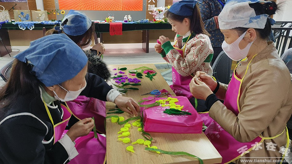 培訓(xùn)現(xiàn)場,婦女們?nèi)宄扇簢谝黄,天水市巾幗職業(yè)學(xué)校的培訓(xùn)老師于穎生動地為她們講解如何編織非遺絨花。學(xué)員們跟著模仿起來,一團(tuán)團(tuán)五顏六色的線材,在她們的手指中上下左右翻繞,不一會就變成了一朵朵顏色艷麗的小花。