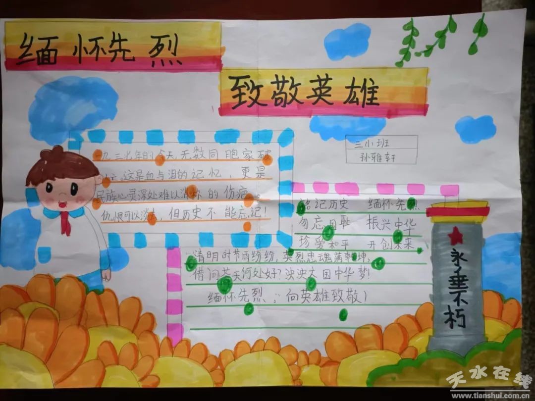 同時,各學校開展了形式多樣的實踐教育活動。藉口鎮(zhèn)中心小學開展“慎終追遠·緬懷先烈”為主題的教育活動,各班進行了“緬懷革命先烈 弘揚時代新風”為主題的板報評比活動,大家用手中的粉筆勾勒出一幅幅美麗的畫卷,書寫著對革命烈士的敬仰。秦嶺鎮(zhèn)中心小學的少先隊員們通過手抄報的方式,向英烈們致敬。楊家寺中心小學一、二、三年級開展以“清明追思 文明祭祀”為主題的清明節(jié)班會活動,四、五、六年級開展以“緬懷革命先烈,傳承紅色基因”為主題的清明節(jié)班會活動,從小培養(yǎng)學生的愛國主義情懷,讓學生感受清明節(jié)的傳統(tǒng)文化。