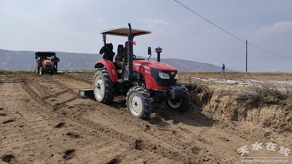 同樣,在秦州區(qū)菊愛農場千畝大豆玉米復合種植基地現場,農機的轟鳴聲喚醒了沉睡的土地,多輛大型農業(yè)機械穿梭在田間地頭,交織成了一幅美麗的春耕圖。