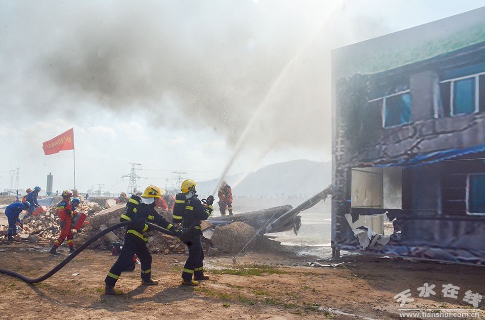 此次演習模擬天水市秦州區(qū)發(fā)生6.1級地震,受強震波及,秦州區(qū)部分橋梁損壞,電力、通信中斷,多處房屋倒塌且引發(fā)民房火災,有人員被困;某加油站油罐車損壞,油料泄漏著火;某小學老師組織學生疏散撤離;某湖面清理垃圾工作人員因驚慌落水被困。地震發(fā)生后,區(qū)政府迅速啟動《秦州區(qū)地震應急預案》,區(qū)抗震救災指揮部成員單位迅速響應,在區(qū)委、區(qū)政府帶領下開展搶險救援。