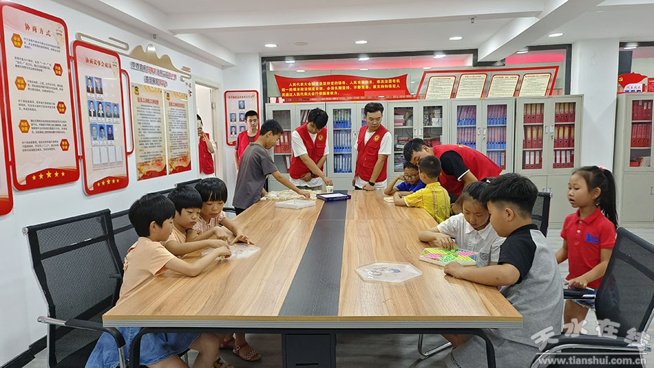 在綠色市場社區(qū),大學生志愿者化身“老師”,有的在耐心細致地輔導社區(qū)的孩子們完成暑假作業(yè),有的組織孩子們觀看愛國主義教育影片,對他們進行愛國主義教育,有的則和孩子們一起下棋、跳繩、踢毽子,玩得不亦樂乎。
