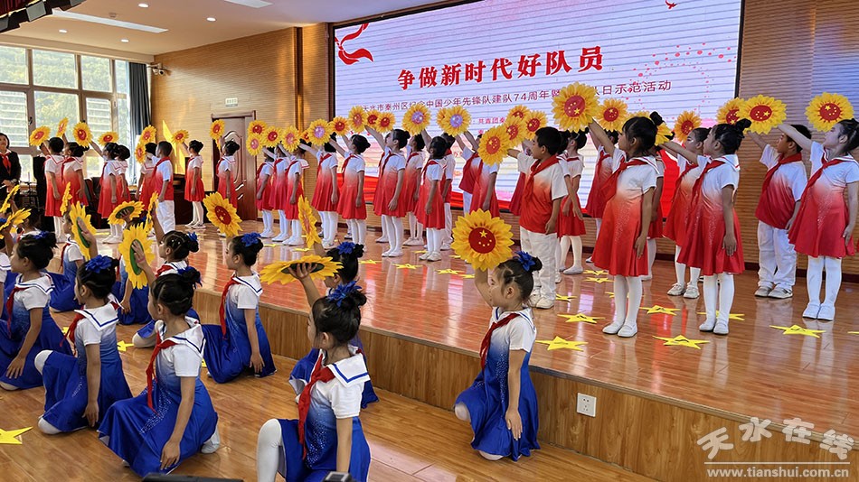 入隊儀式上,天水郡小學68名新隊員光榮加入中國少年先鋒隊,少先隊員代表為新隊員佩戴紅領巾,新隊員們在隊旗下,立下為共產(chǎn)主義事業(yè)貢獻力量的錚錚誓言。隨后,隊員們表演了葫蘆絲合奏《花兒香》、合唱《童心向黨》《紅星歌》等節(jié)目,表達了對黨、對祖國的熱愛。