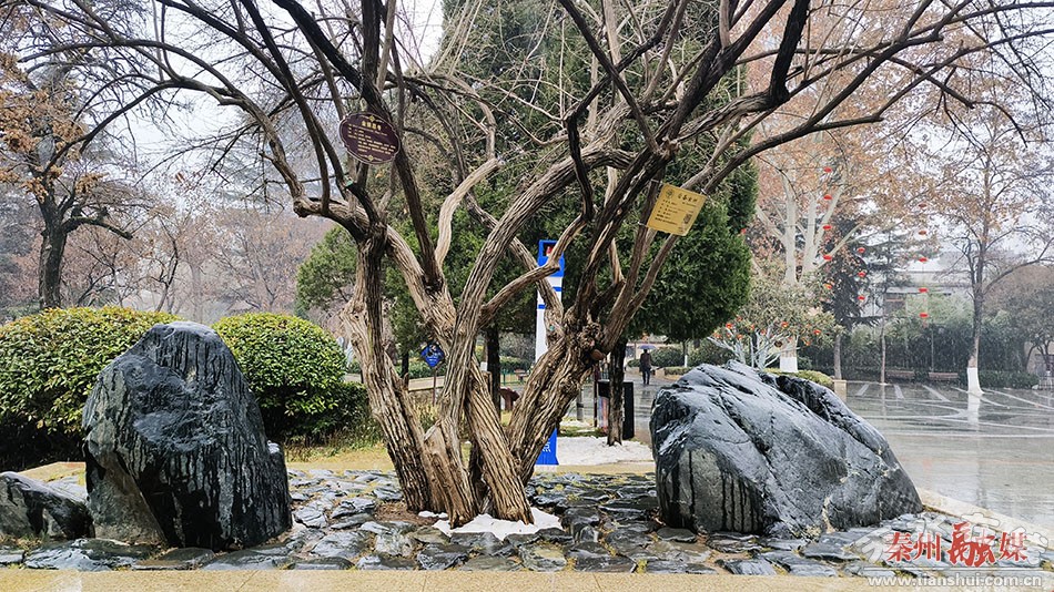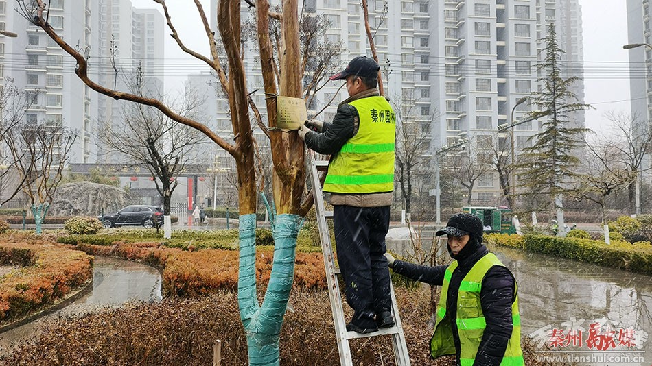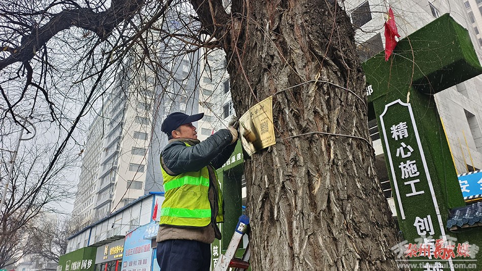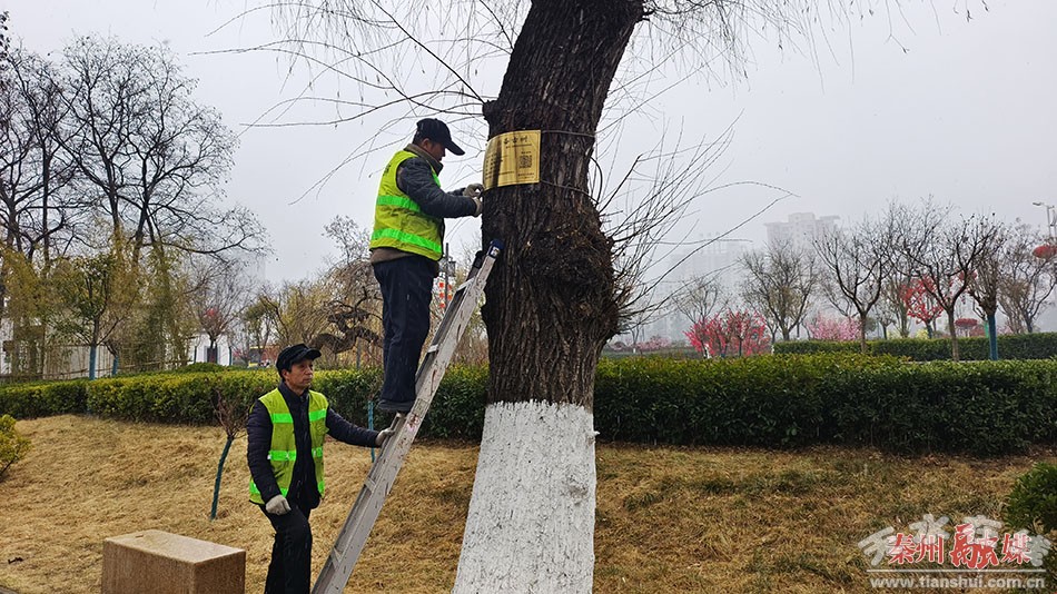 “組織5名工作人員,今天下午共完成人民公園12株后備古樹掛牌工作,其中包括旱柳、金銀忍冬、側(cè)柏、紫薇4個(gè)樹種的掛牌工作。我們采用拉簧固定掛牌,對(duì)樹木進(jìn)行一定的保護(hù),掛牌高度在兩米以上,便于市民識(shí)別觀賞。”秦州區(qū)園林建設(shè)服務(wù)中心工作人員李小鵬說。